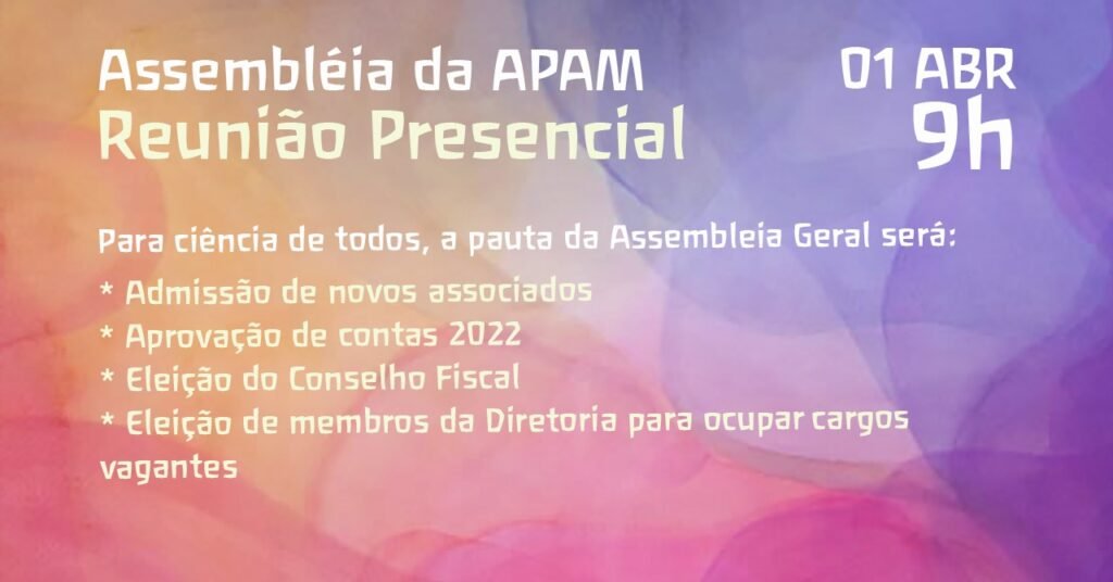 O Diretor Vice-Presidente e o Diretor Tesoureiro da APAM-RJ vêm, por meio desta, convocá-los para as Assembleias Gerais Ordinária e Extraordinária da APAM-RJ, que serão realizadas no mesmo dia 01 de abril de 2023, às 08h:30, em primeira convocação, deliberando, nesta, apenas com a presença mínima da maioria absoluta dos associados com direito à voto, e, em segunda convocação, às 9:00h, deliberando, nesta, com qualquer número de associados com direito à voto.