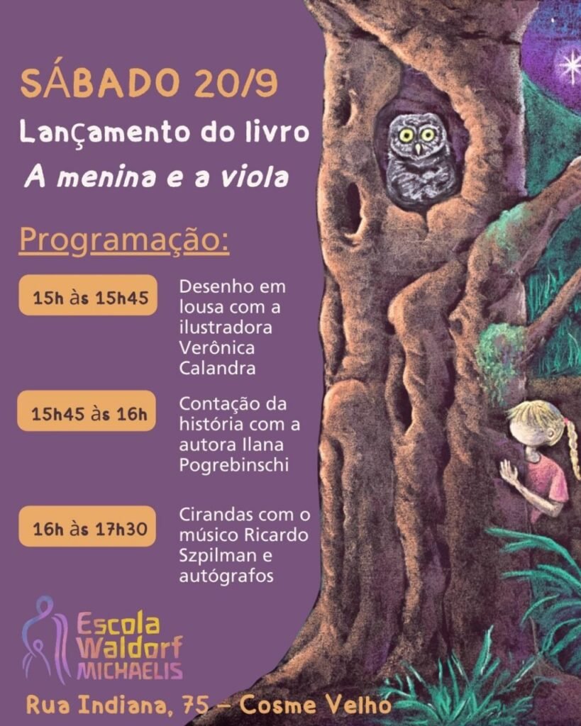 O evento do dia 20 será na Escola Waldorf Michaelis, no Cosme Velho, e começa às 15h. A programação conta com desenho ao vivo em lousa pela ilustradora que trouxe cor ao universo do livro, Verônica Calandra, contação da história com a autora Ilana Pogrebinschi, cirandas com Ricardo Szpilman, sessão de autógrafos e um momento de comemoração pelos 25 anos de contação de histórias da autora. Já no dia 21, o lançamento subirá a serra para Teresópolis, mais especificamente na comunidade de aprendizagem Colo da Montanha. Ilana irá levar o livro para a Festa da Primavera, evento da comunidade aberto ao público, em uma programação que começa às 10h e incluirá um show do cantor, compositor e musicista Pedro Miranda.