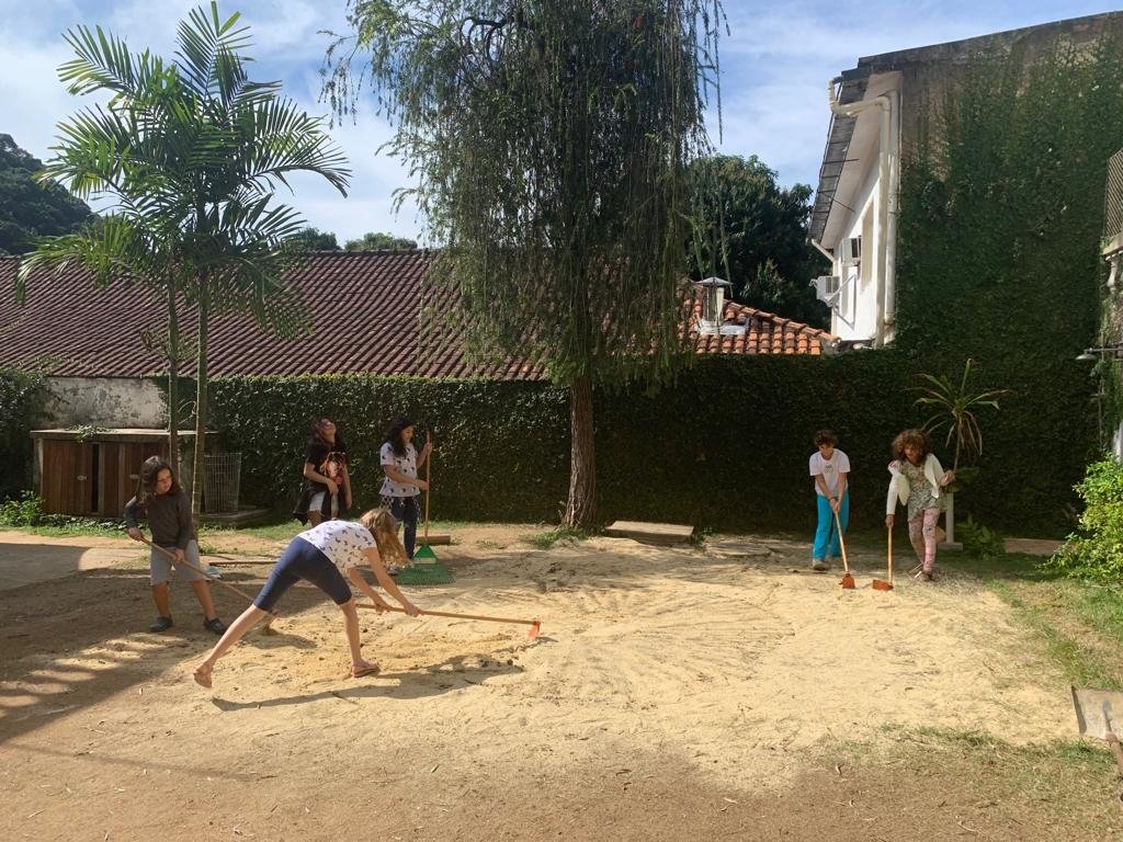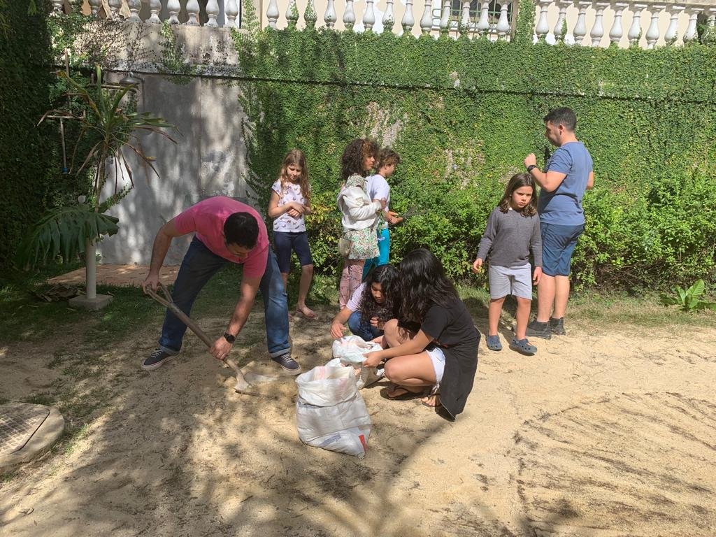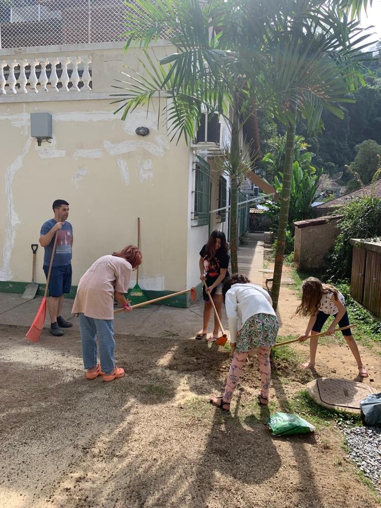 Muitas tarefas foram realizadas, como: limpeza e poda do jardim; limpeza da fachada da escola, nivelamento do pátio da frente com cimento, retirada de toda a areia que sustentava o palco e aproveitamento dela para tapar os buracos do gramadão, nivelando o espaço.