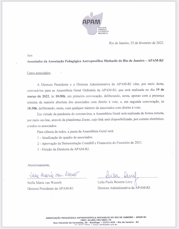 Prezados Associados e Comunidade Educadora Waldorf Michaelis