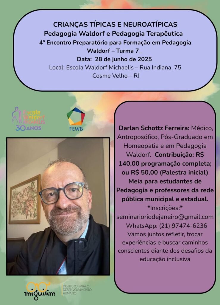 O tema do encontro será “CRIANÇAS TÍPIDAS E NEUROATÍPICAS” trazido pelo Dr. Darlan Schottz Ferreira, médico antroposófico, Pós-Graduado em Homeopatia e em Pedagogia Waldorf.