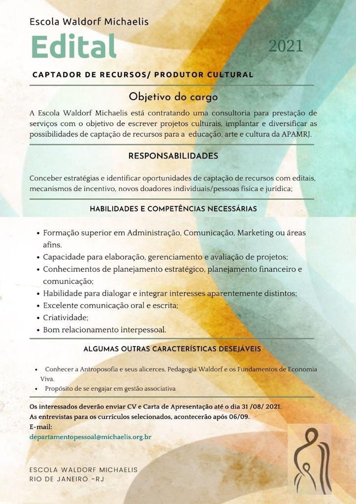 A Escola Waldorf Michaelis está contratando uma consultoria para prestação de serviços com o objetivo de escrever projetos culturais, implantar e diversificar as possibilidades de captação de recursos para a educação, arte e cultura da APAMRJ.