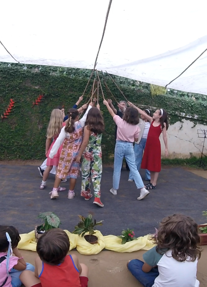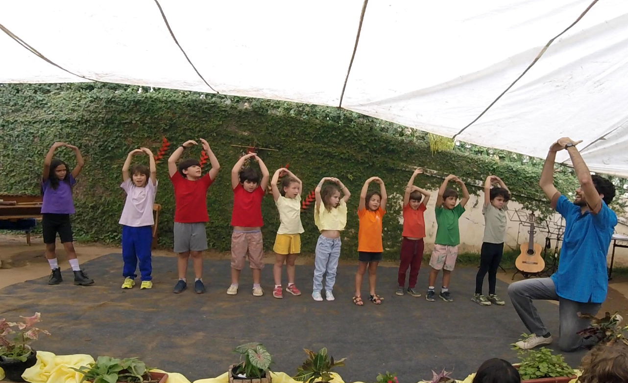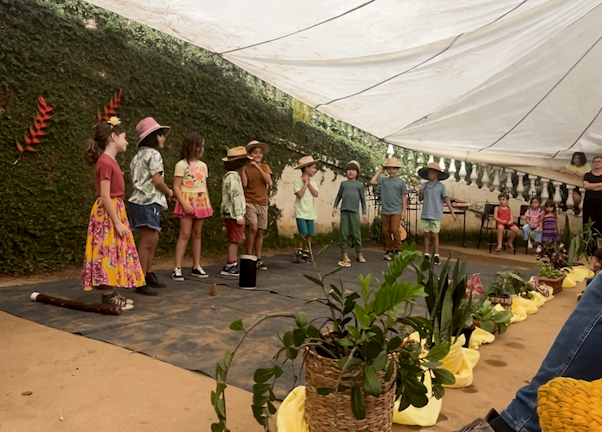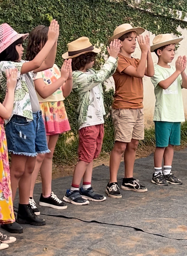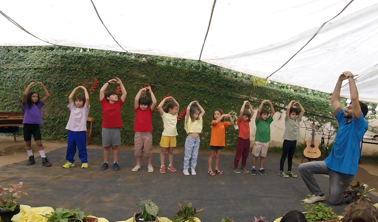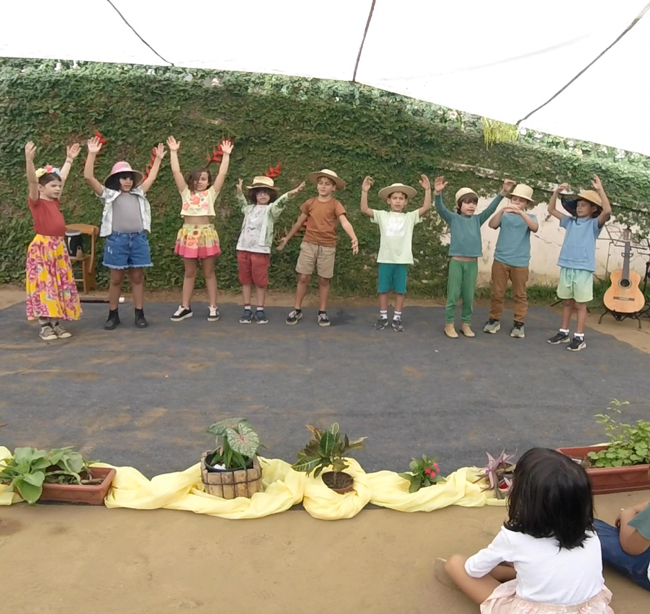 Em seguida, o 3° ano, guiado pela professora Thamires, apresentou uma roda com verso e canção sobre o plantio, tema central da vivência deste grupo, que se conecta com o trabalho da terra e com os ciclos da natureza.