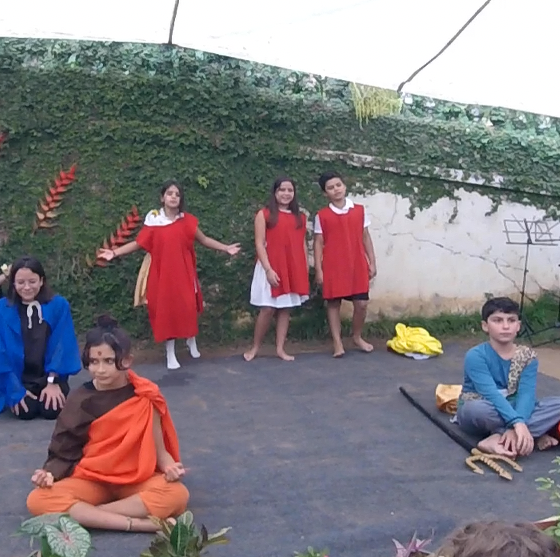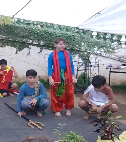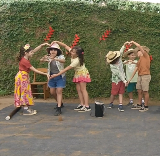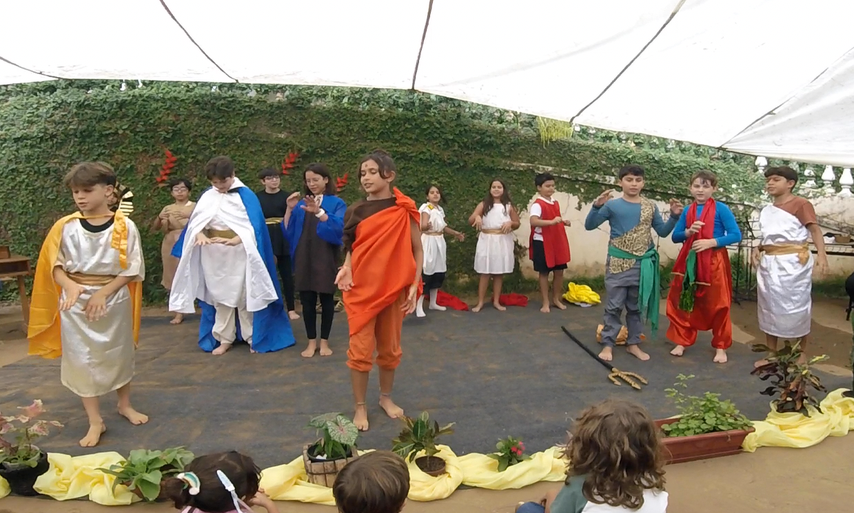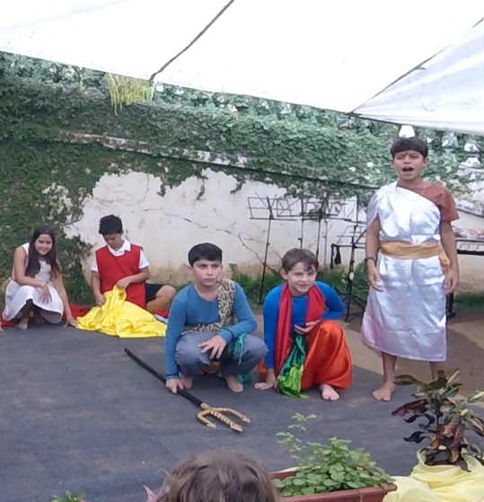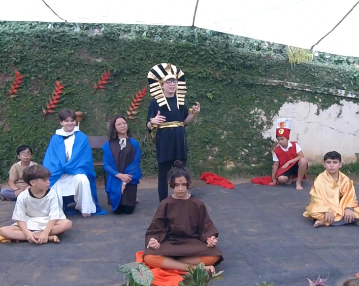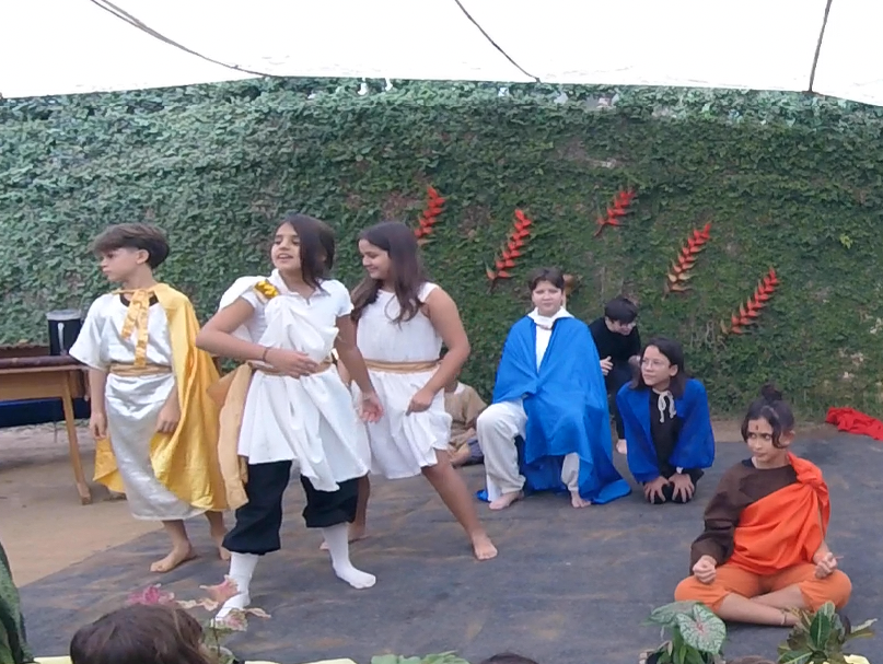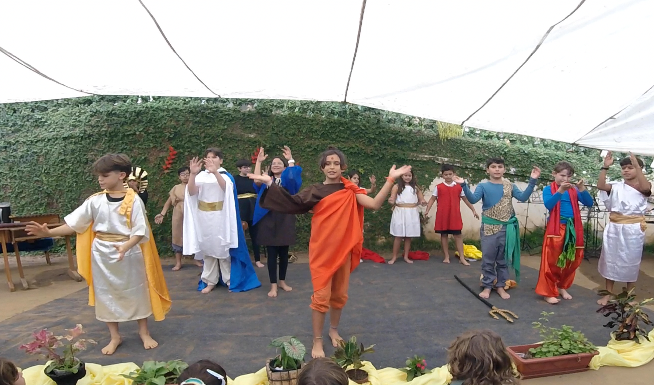 Encerrando a manhã, o 5° ano, com a professora Joselma, encenou uma peça de Ruth Salles sobre as Antigas Civilizações estudadas ao longo do semestre.