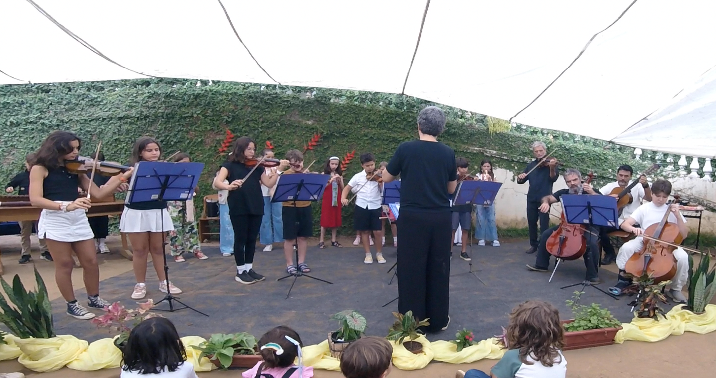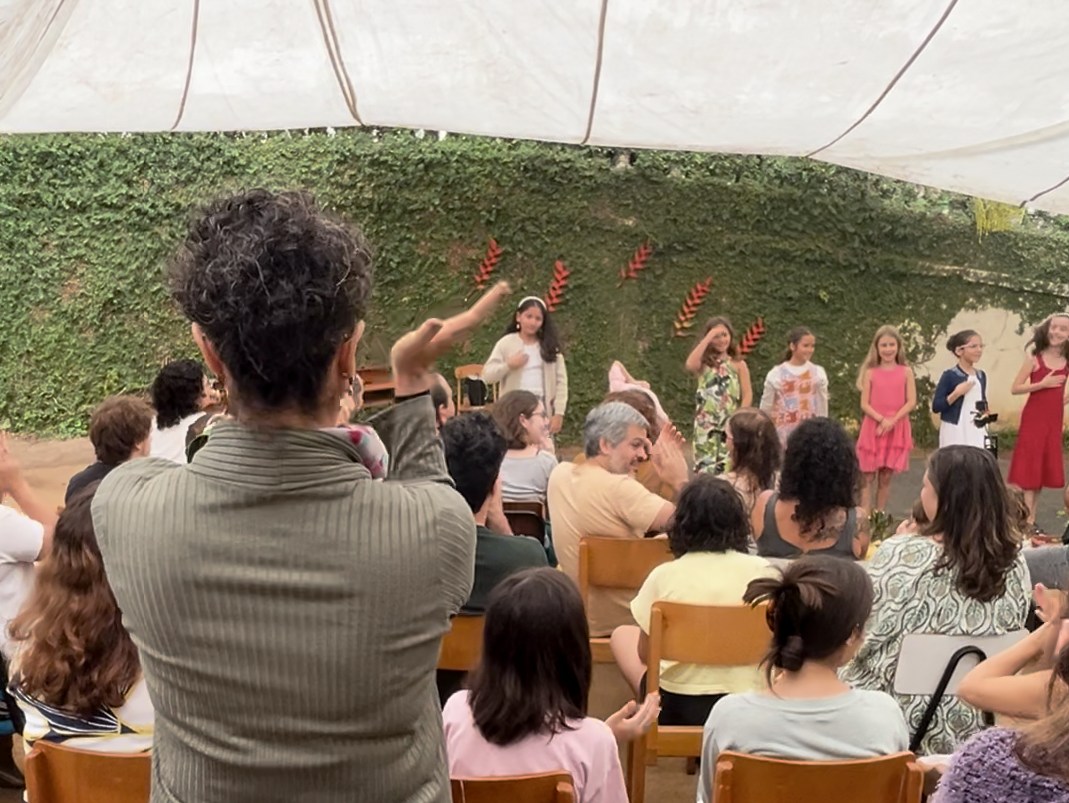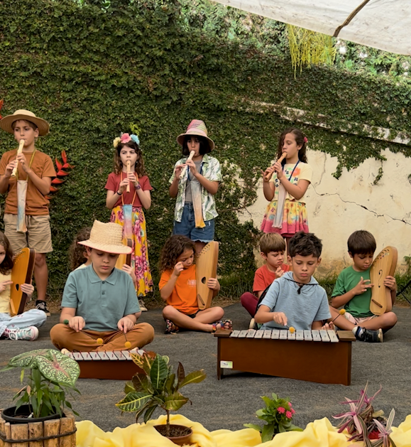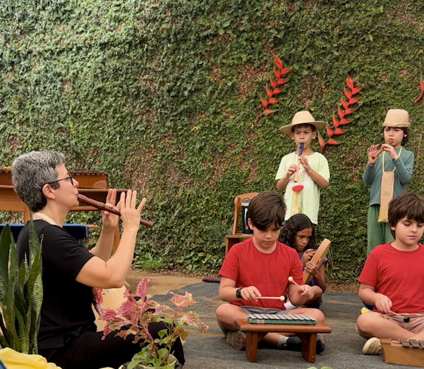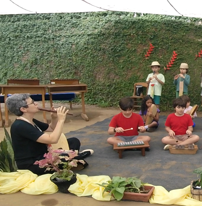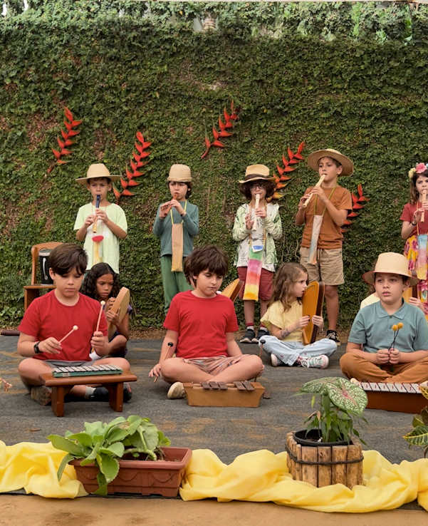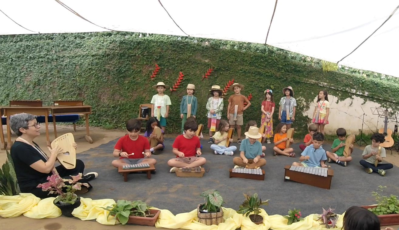 A manhã se iniciou com a apresentação conjunta do 2° e 3° anos, conduzida pela professora de música Marília. As crianças contaram e musicaram “A História da Sementinha”, utilizando flauta doce, percussão e kânteles.