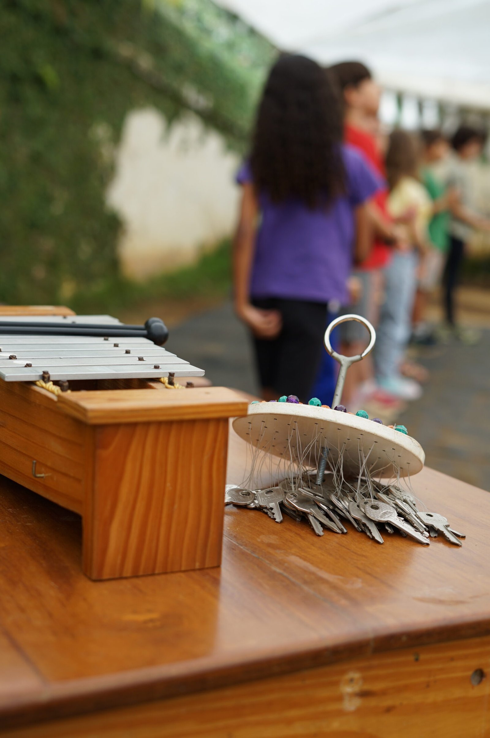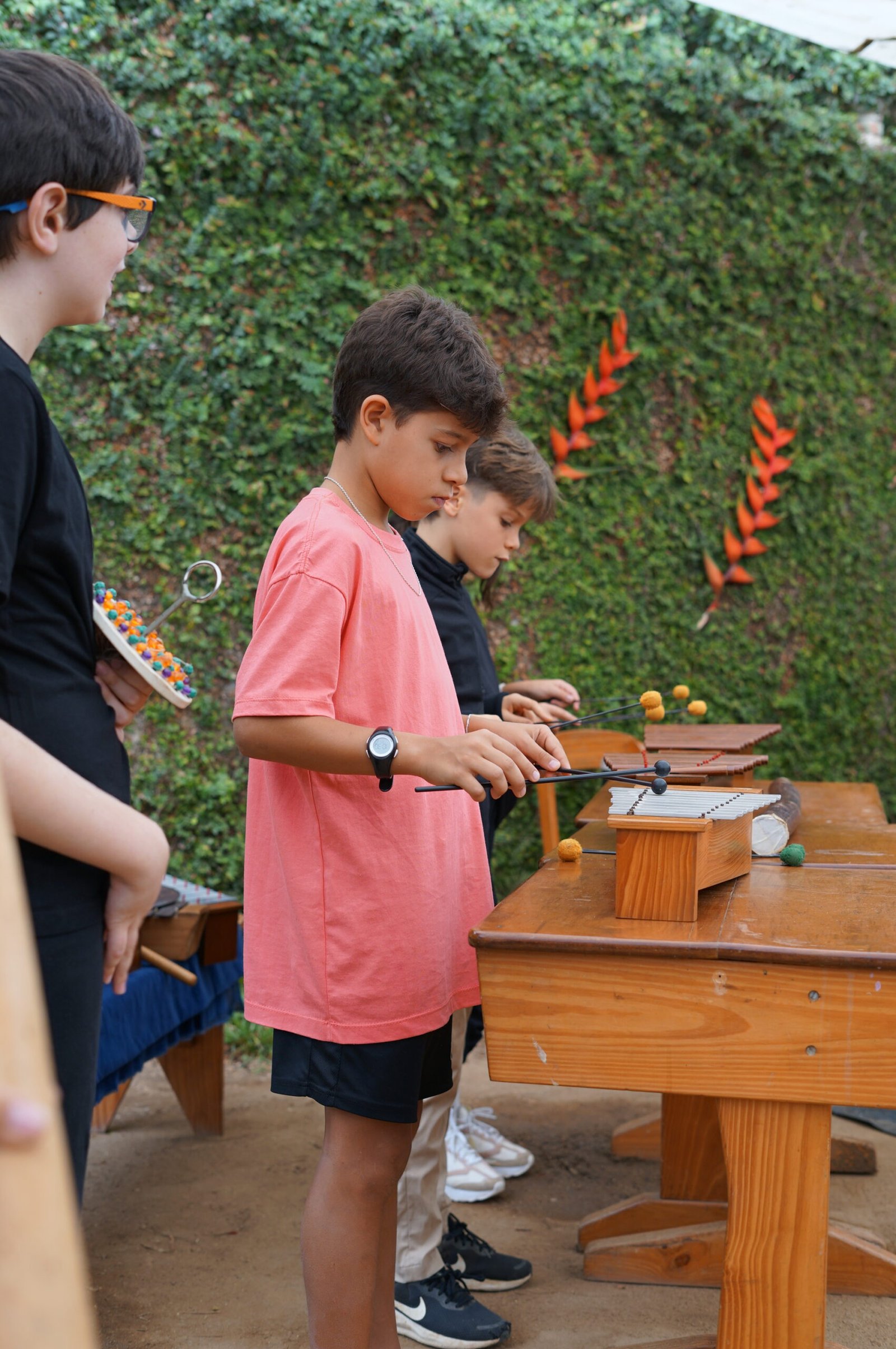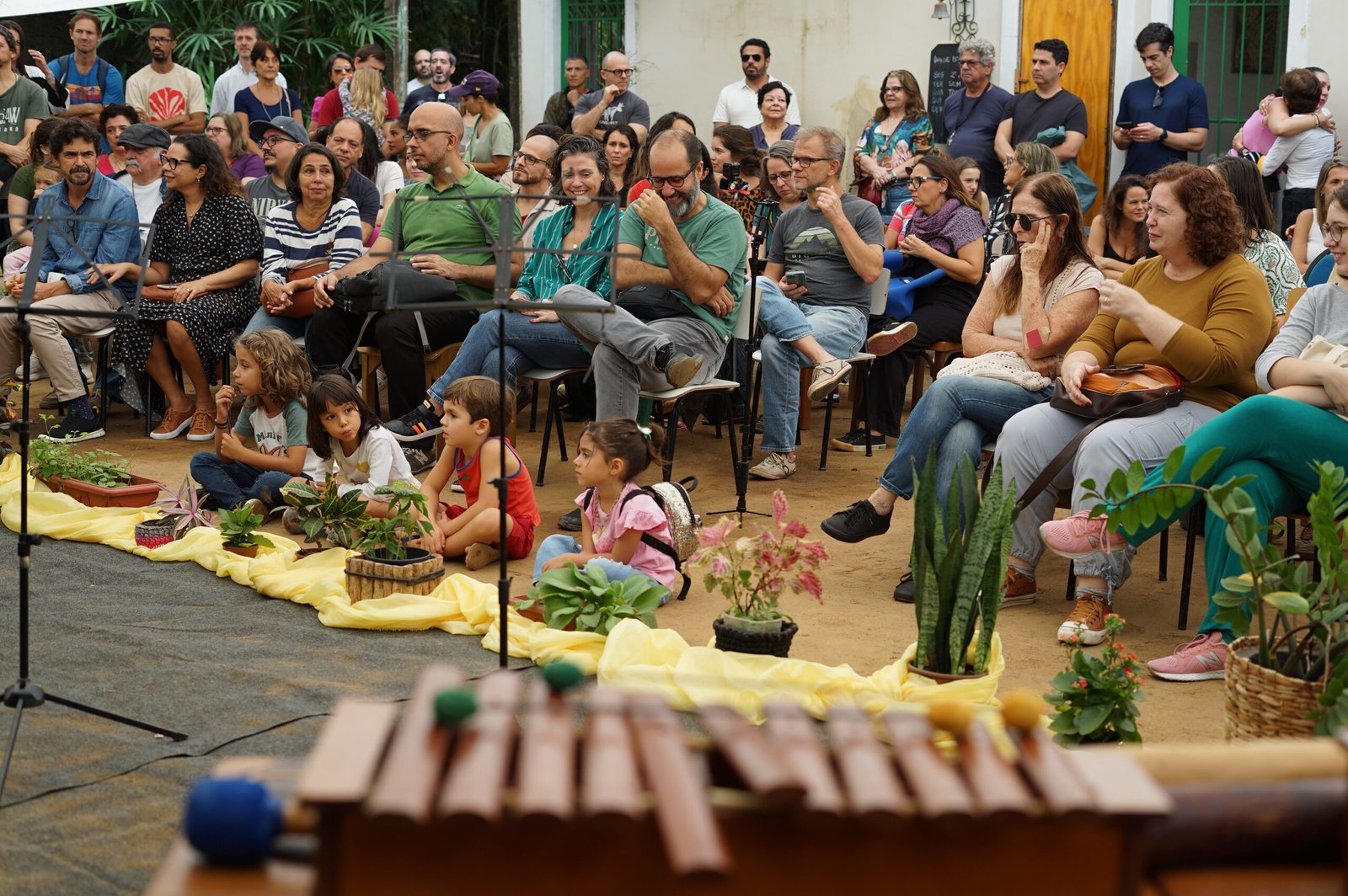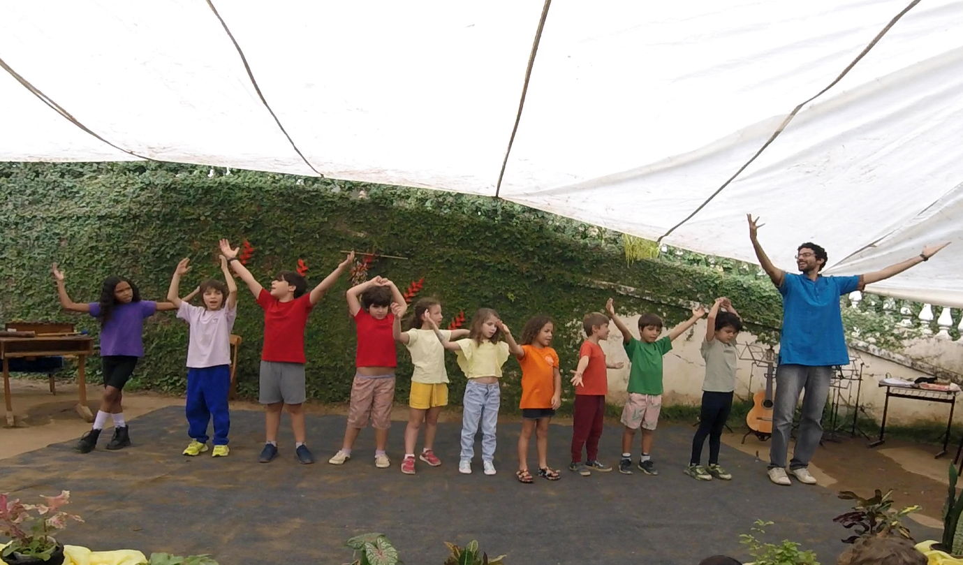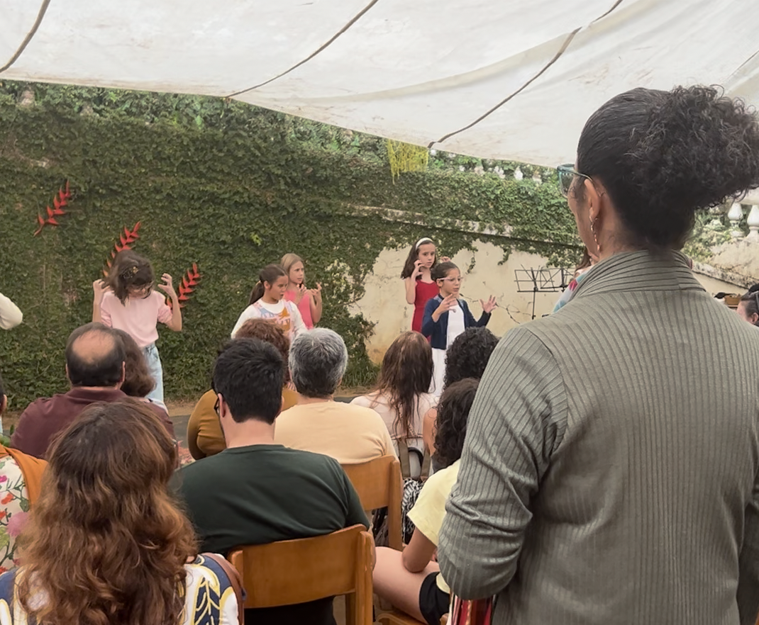 A manhã se iniciou com a apresentação conjunta do 2° e 3° anos, conduzida pela professora de música Marília. As crianças contaram e musicaram “A História da Sementinha”, utilizando flauta doce, percussão e kânteles.