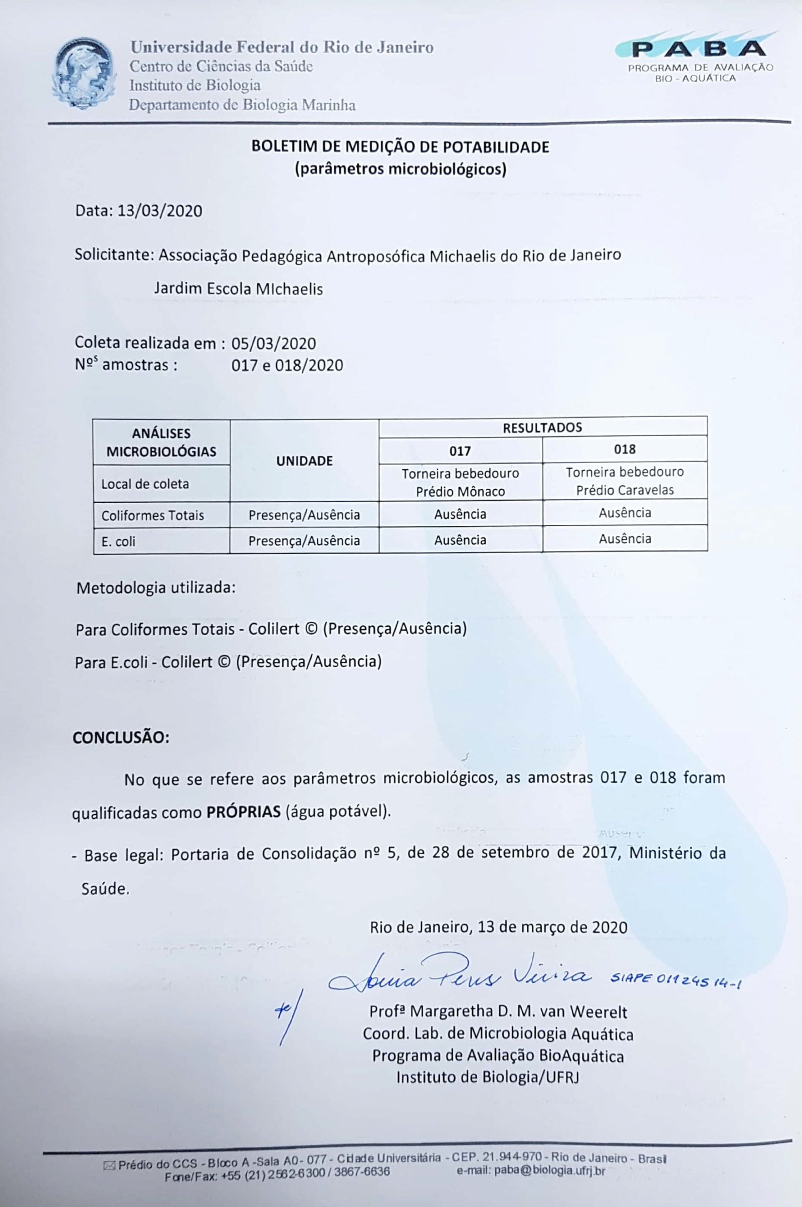 Para uma dupla checagem da qualidade da água, chamamos a equipe de microbiologia da UFRJ para realizar a análise da potabilidade da água nas duas sedes que atestou, através de laudo técnico anexo, que ela se encontra apta ao consumo humano.