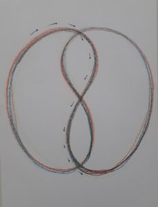 O exercício do desenho de forma nos convoca para estarmos presentes, atentos a nós mesmos, às nossas ações, à nossa existência. Há muitas formas possíveis de se desenhar uma leminiscata. A forma apresentada hoje é um bom exemplo de como a presença no “fazer” é fundamental, se “dormirmos” no traçar das linhas vamos acabar nos perdendo na forma.