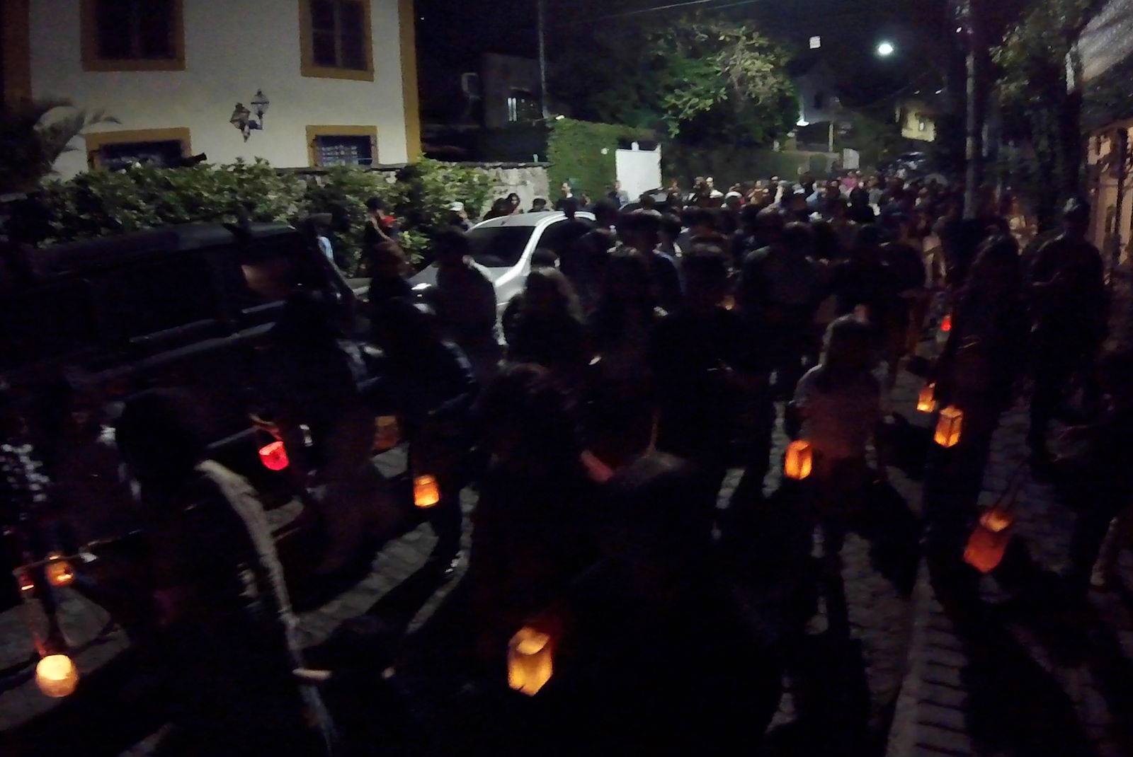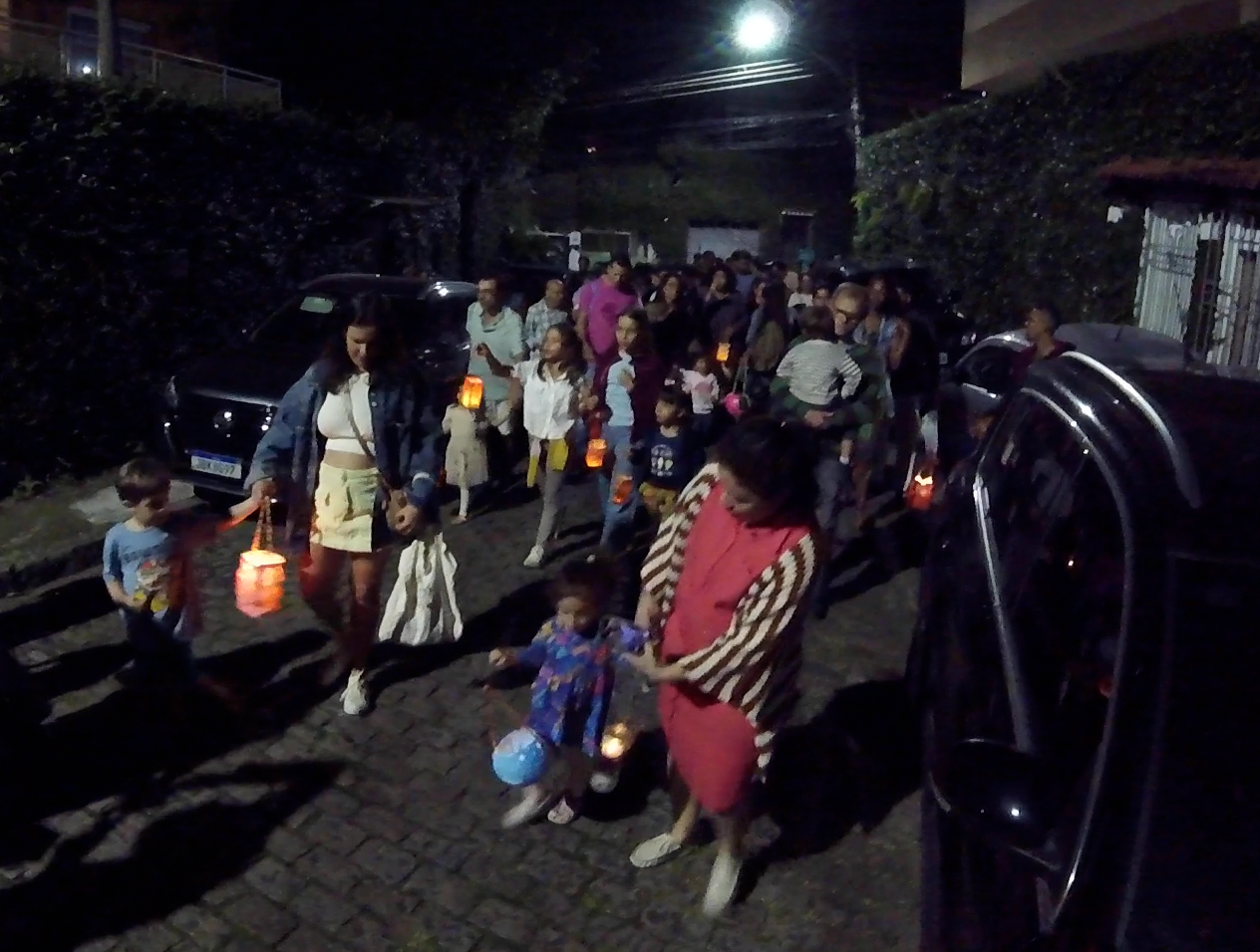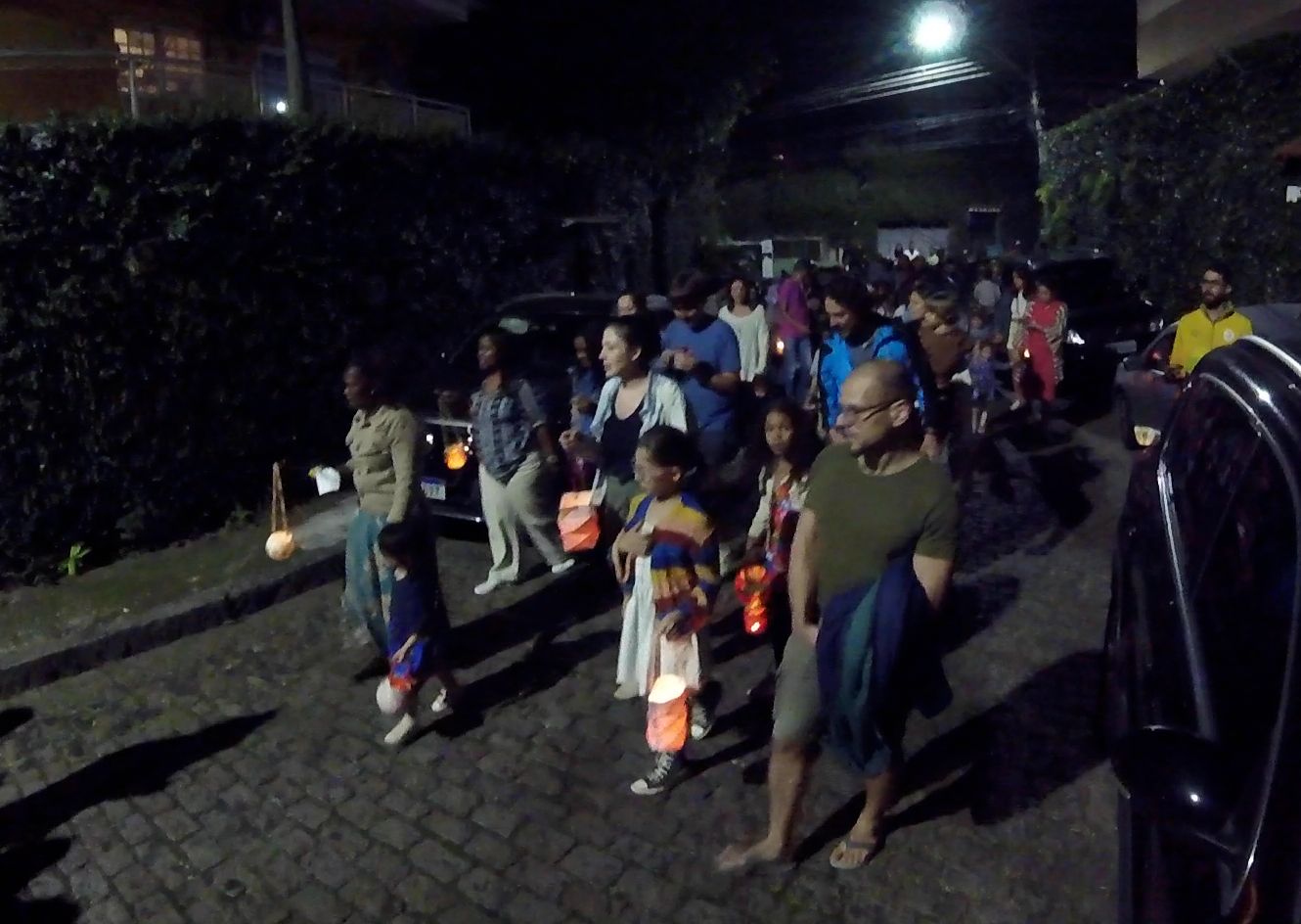Após a apresentação, seguimos todos juntos — crianças pequenas com seus pais e suas lanternas feitas à mão, professores e amigos da escola — em um cortejo pela Rua Itamonte. As pequenas chamas iluminavam o caminho, refletindo a luz que cada um carrega dentro de si. A canção que embalou nosso percurso dizia: