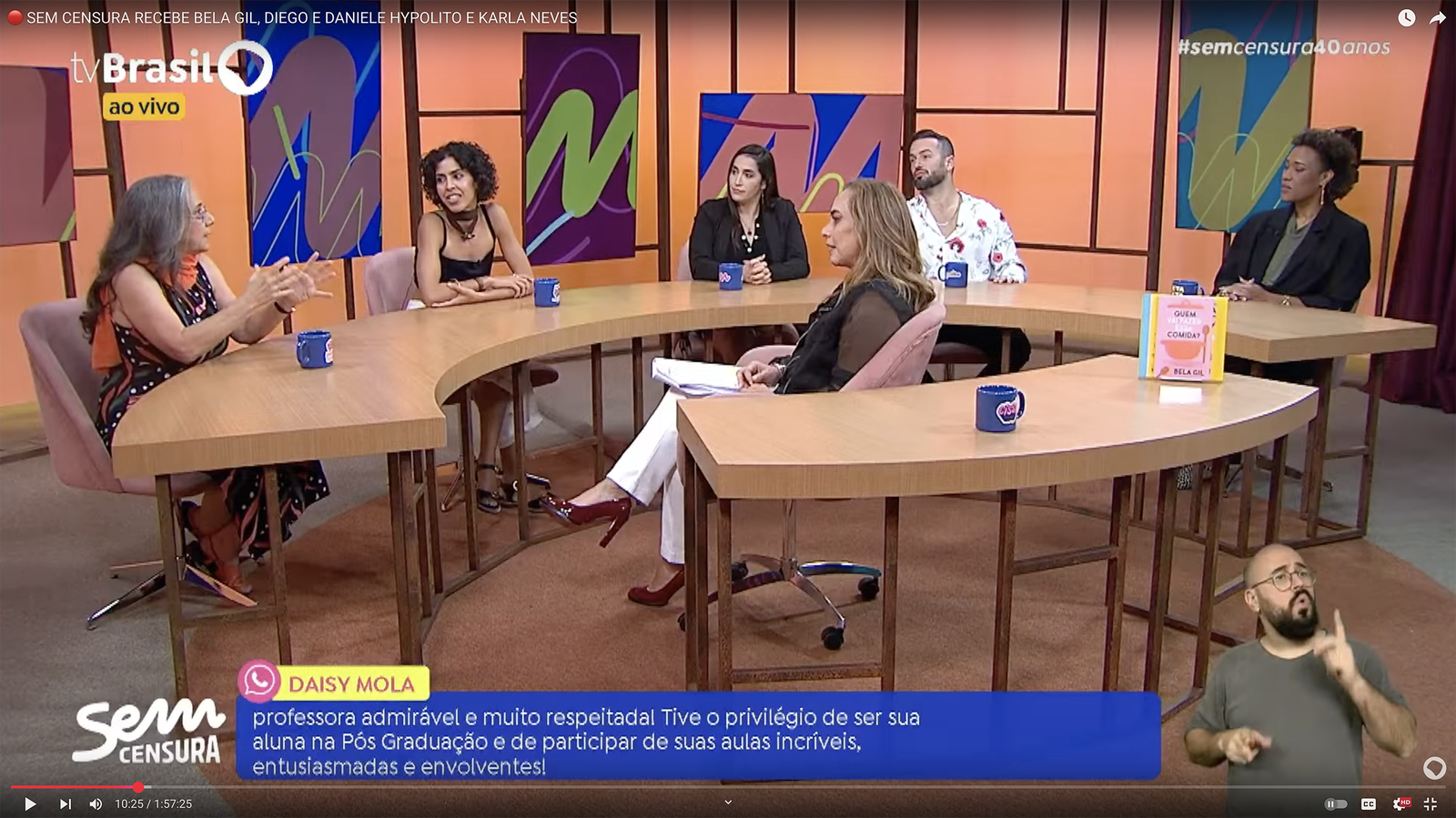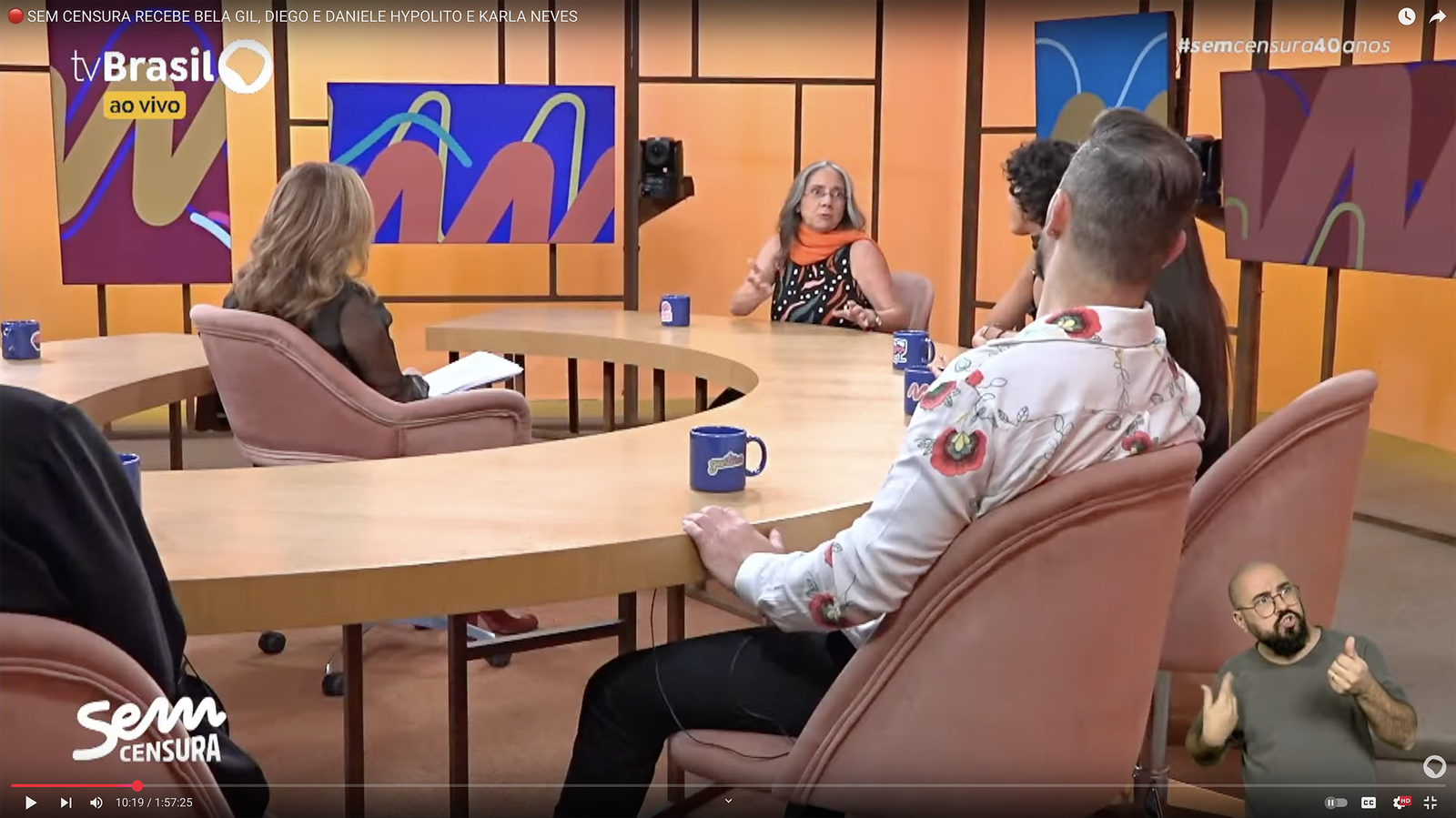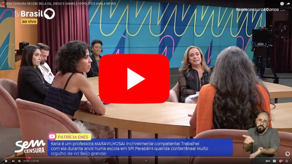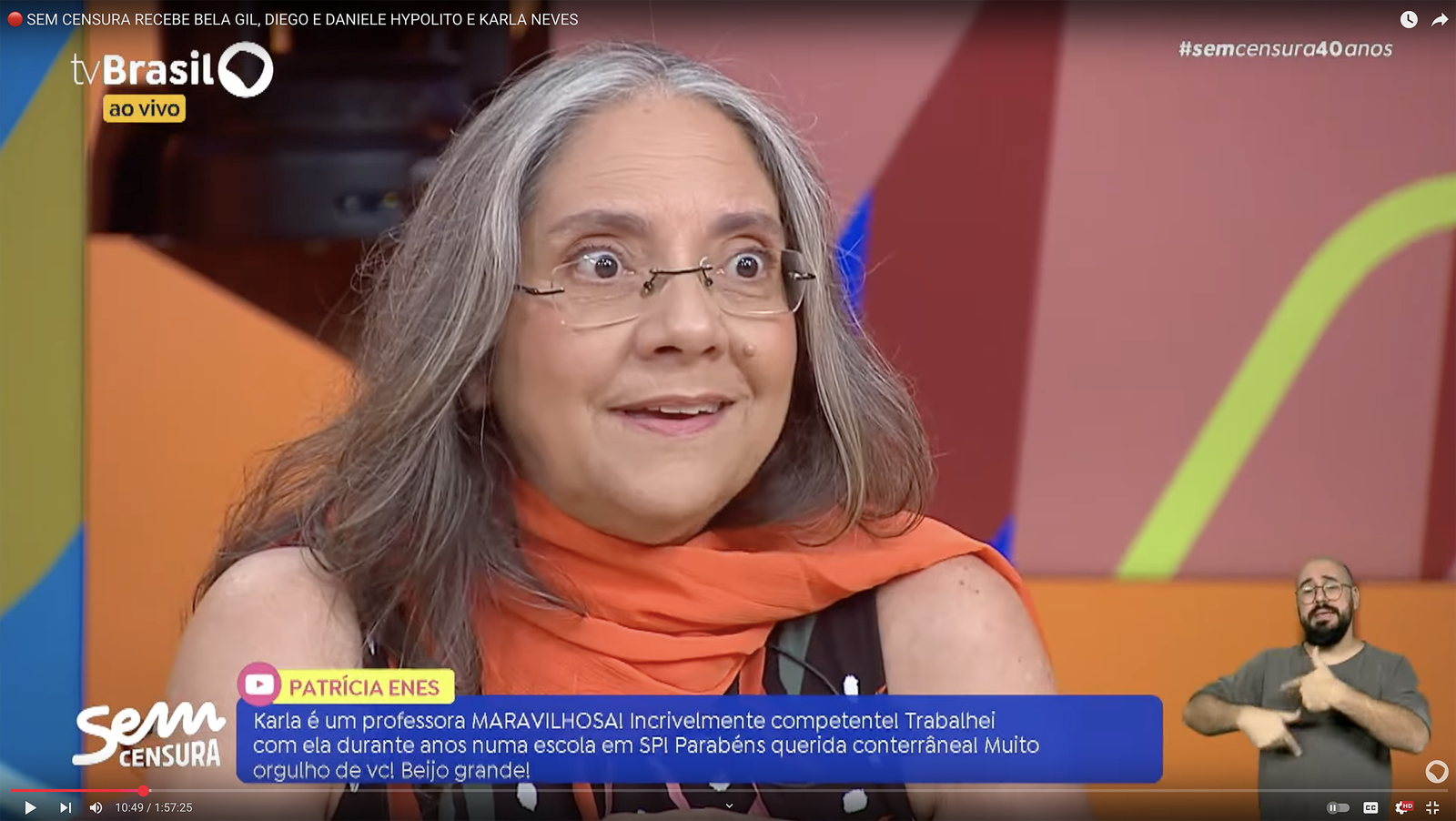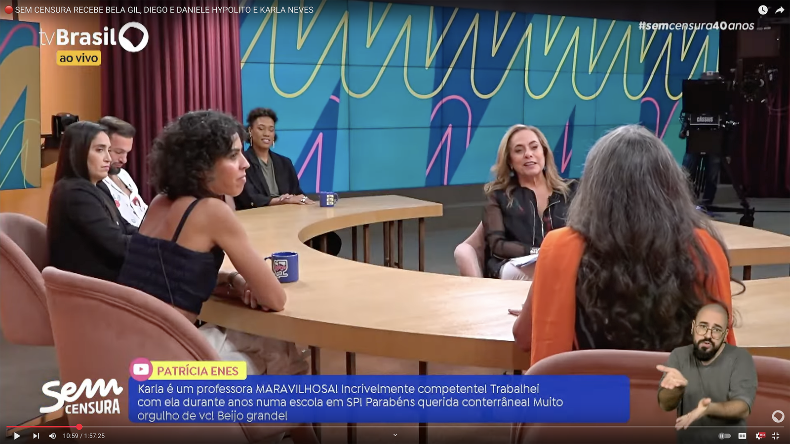 A Professora de Classe do nosso 8°ano, Karla Neves, foi uma das entrevistadas na bancada do programa Sem Censura, conduzido por Cissa Guimarães na Tv Brasil, nesta quinta-feira, 19/JUN/2025.